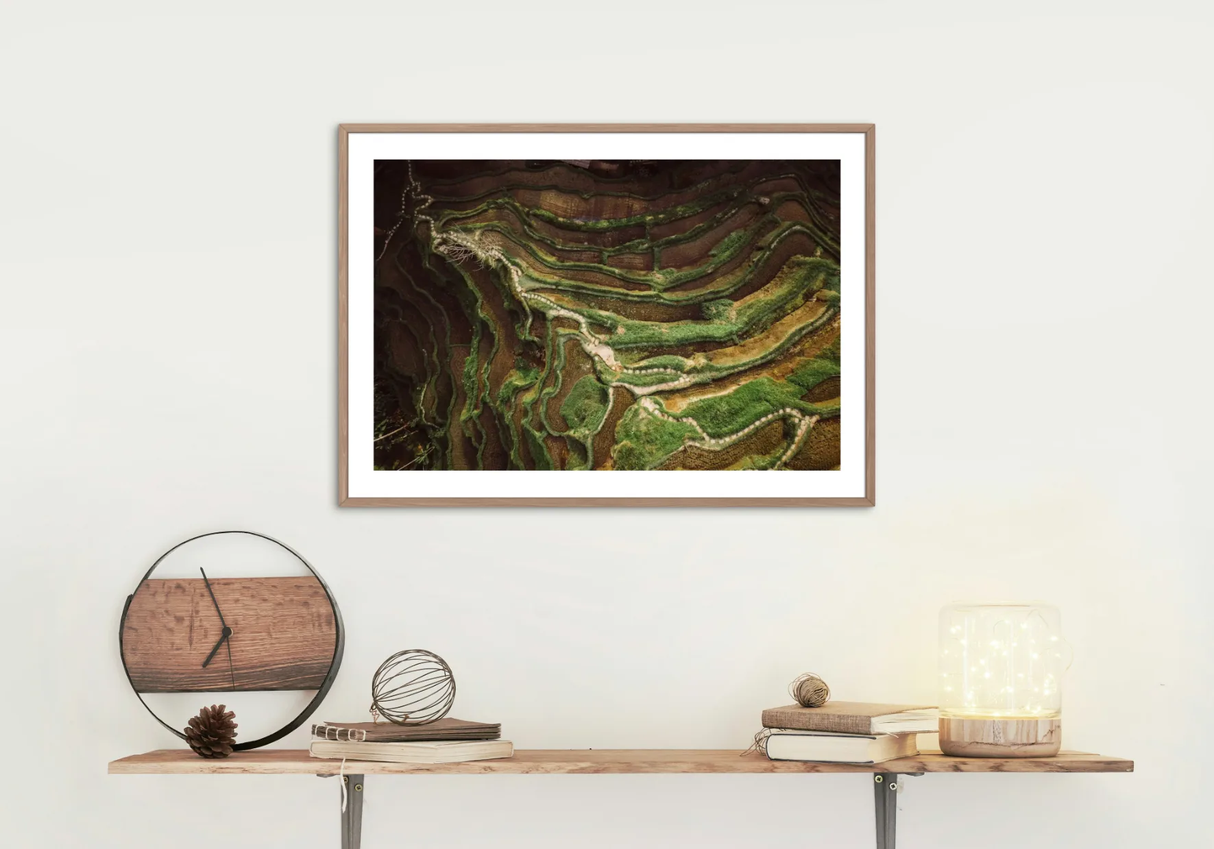 From the skies above Indonesia, the landscape of Bali transforms into a breathtaking pattern of shape and shadow. This print captures the hand-sculpted rice terraces as they ripple across the terrain like green stairways. The natural gradients, shifting light, and razor-sharp geometry combine to create something that feels almost surreal.