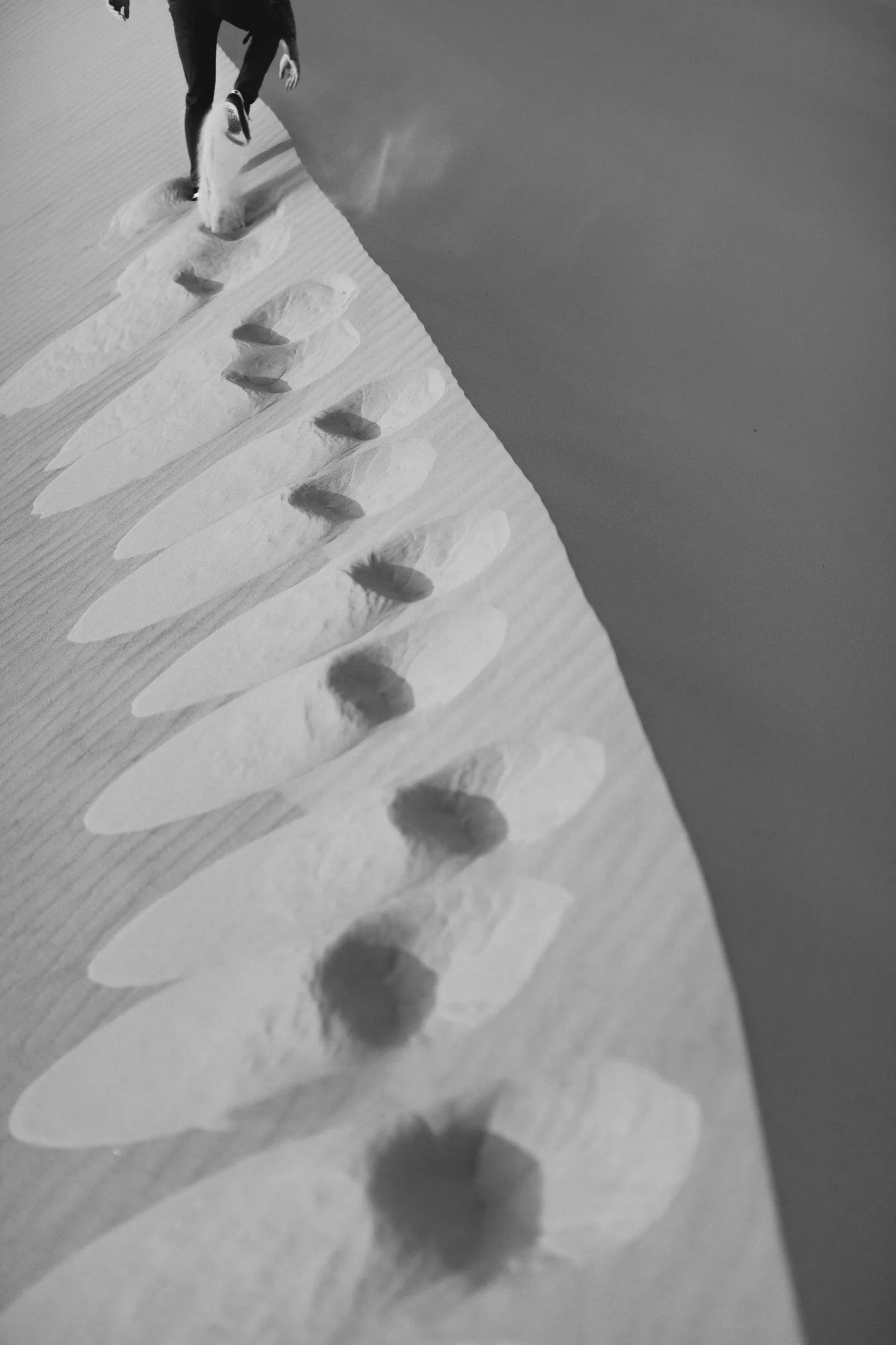 An abstract black-and-white moment from the Kelso Sand Dunes. No footprints. Just one figure and a clean, surreal landscape.