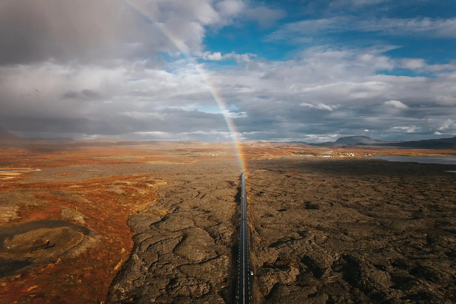While driving through Iceland’s Myvatn wetlands, we caught a fleeting moment of contrast that felt like something out of a storybook. A powerful storm was breaking apart overhead, drifting eastward, just as the sun pierced through the clouds. A rainbow emerged — vivid and surreal — landing directly on the road in front of us. The landscape on one side remained dark and moody, while the other glowed with fresh light and color.